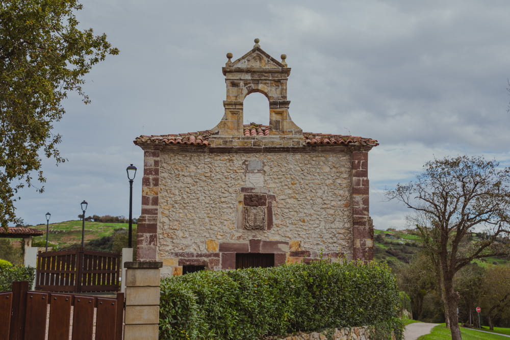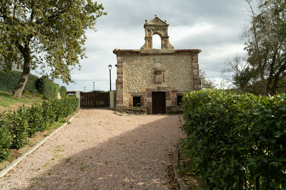 Con planta rectangular dividida en dos tramos iguales, este pequeño templo tiene fachada rematada con pino y puerta adintelada con cerco de sillería y dos ventanas a los lados, además de tres escudos de armas que lo coronan: Lamadrid, Celis y Ceballos.