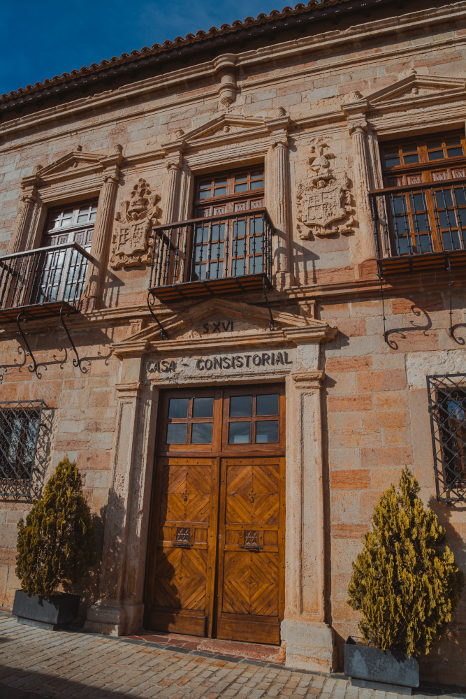 El palacio es de estilo renacentista con planta rectangular, y combina elementos defensivos con detalles más refinados, como los escudos nobiliarios que coronan la fachada. Además, las ventanas enmarcadas en sillería y el balcón central aportan una gran elegancia sin caer en excesos decorativos.